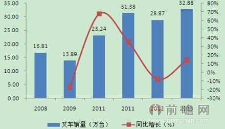 研究院發(fā)布的《2014-2018年中國叉車制造行業(yè)產(chǎn)銷需求預(yù)測與轉(zhuǎn)型升級分析報告》數(shù)據(jù)顯示,2013年中國工業(yè)車輛迎來較為強勁的發(fā)展態(tài)勢,2013年國內(nèi)機動工業(yè)車輛制造企業(yè)五類叉車(機動工業(yè)車輛)銷售量累計達到了328764臺,較2012年的288662臺上升了13.89%。