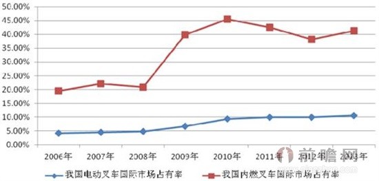 圖表3:2006-2013年我國內(nèi)燃叉車和電動叉車的全球占有率情況(單位:%)
